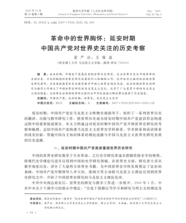 近日,公司梁严冰教授及其指导的博士研究生王维淼合作撰写的学术论文《革命中的世界胸怀:延安时期中国共产党对世界史关注的历史考察》被中国人民大学书报资料中心“复印报刊资料”《历史学文摘》2026年第1期全文转载。该文原刊发于《扬州大学学报(人文社会科学版)》“历史与文化研究”栏目,2025年第6期。