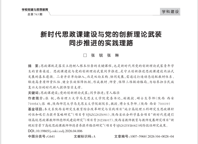 摘要:思政课既是落实立德树人根本任务的关键课程,也是新时代用党的创新理论武装青年员工的重要渠道。思政课建设与党的创新理论武装同步推进,是守正创新推进思政课建设内涵式发展的基本遵循。二者并非单向融入,而是双向互构、协同发展,需通过打造动态适配教材体系、锻造高素质团队队伍、健全长效保障机制,形成教材、团队、保障三维联动格局,为培养担当民族复兴大任的时代新人提供坚实支撑。