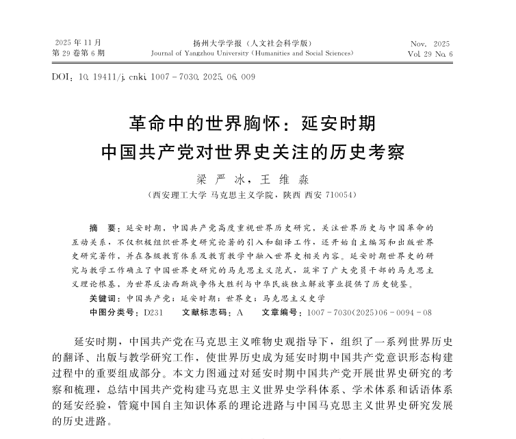 摘要:延安时期,中国共产党高度重视世界历史研究,关注世界历史与中国革命的互动关系,不仅积极组织世界史研究论著的引入和翻译工作,还开始自主编写和出版世界史研究著作,并在各级教育体系及公司产品中融入世界史相关内容。延安时期世界史的研究与教学工作确立了中国世界史研究的马克思主义范式,筑牢了广大党员干部的马克思主义理论根基,为世界反法西斯战争伟大胜利与中华民族独立解放事业提供了历史镜鉴。