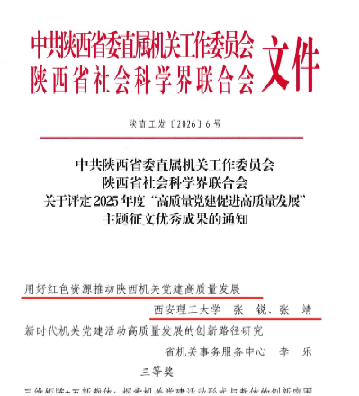 张锐、张靖撰写的“用好红色资源推动陕西机关党建高质量发展”文章荣获2025年度省直机关工委、省社科联“高质量党建促进高质量发展”主题征文优秀成果二等奖。
