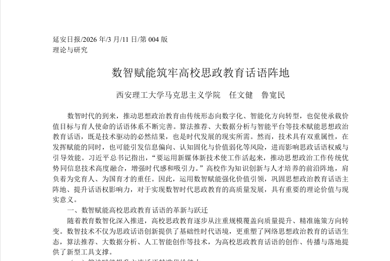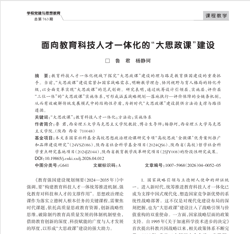 摘要:教育科技人才一体化视域下探究“大思政课”建设的理与路是教育强国建设的重要抓手。当前,“大思政课”建设需紧扣国家战略需求,明晰教学理念、协同视野与育人格局的转化升级,以全面变革实现“大思政课”的范式创新。研究表明,通过统筹设计引领层、实施层、评价层“三位一体”的“大思政课”实施体系,可形成涵盖战略规划—落地执行—评价保障的全链条机制,从而有效破解传统发展模式中的结构性矛盾,为新时代“大思政课”建设提供方法论支撑与路径遵循。