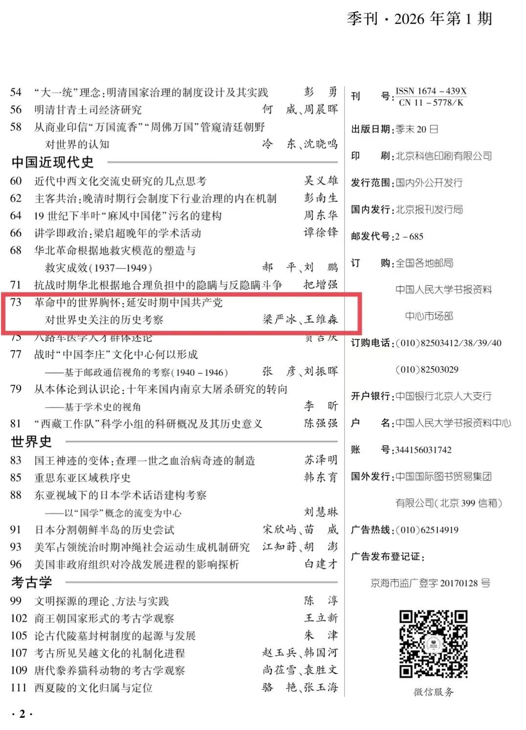 期刊:人大复印报刊资料《历史学文摘》2026年第1期全文转载