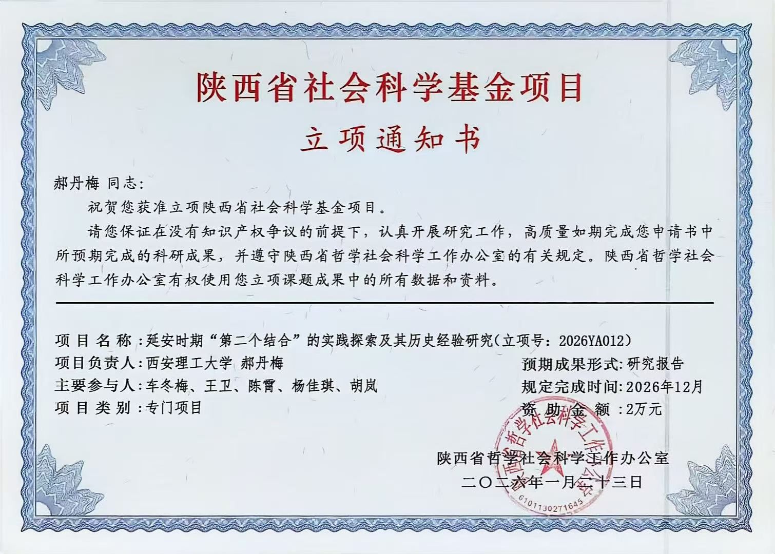 获批陕西省哲学社会科学“2026年旬邑县重点领域基础设施提升和经济产能结构优化研究”研究专项