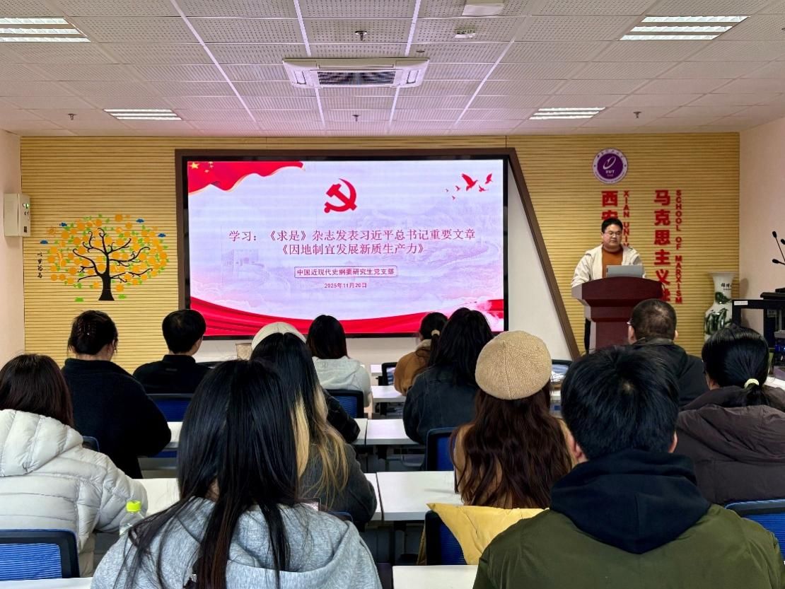 为深入学习贯彻党的最新理论成果,提升支部党员的政治素养和理论水平,2025年11月20日,中国近现代史纲要研究生党支部、研究生基层党建服务队党支部在综南楼911会议室组织召开11月主题党日活动,围绕党的二十届四中全会精神和《求是》杂志发表的习近平总书记重要文章《因地制宜发展新质生产力》开展专题学习。