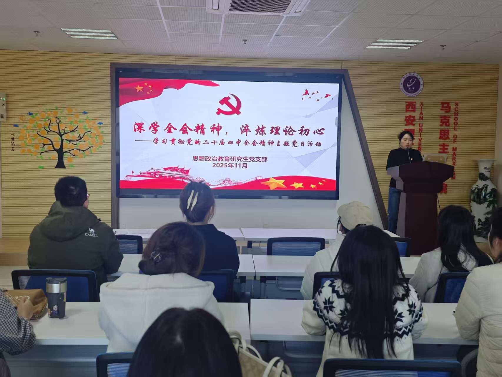 为深入学习贯彻党的二十届四中全会精神,筑牢支部成员的思想根基,11月28日,思想政治教育研究生党支部在911报告厅开展“深学全会精神,淬炼理论初心——学习贯彻党的二十届四中全会精神”主题党日活动,本次活动由党支部书记李妮同志主持。