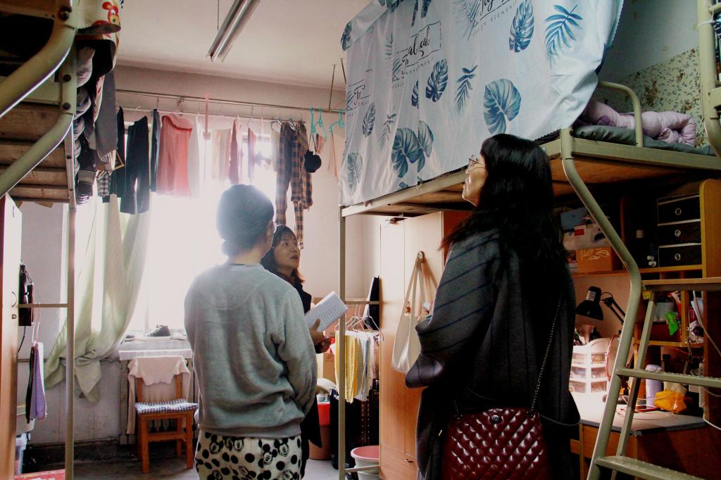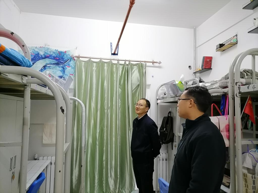 张锐向同学们了解住宿情况,询问同学们日常生活遇到的问题并给予了建议,并再次强调冬季是各类安全事故的高发期,同学们务必要提高安全意识,离开宿舍切记切断电源,杜绝不良的生活习惯。孙六平也叮咛同学们一定要注意寝室安全,安全用电,禁止在宿舍使用违规电器,保持寝室的整洁。