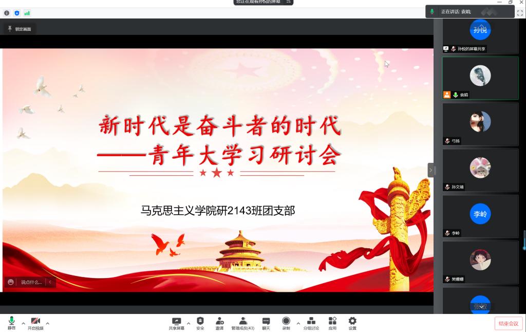 为深入学习贯彻习近平新时代中国特色社会主义思想和党的十九大精神,推进青年团员深入理解习近平新时代中国特色社会主义思想,充分调动青年团员学习“青年大学习”的积极性,3月23日,伟德国际1949研2143班团支部线上开展“新时代是奋斗者的时代”主题交流研讨会,支部全体成员参加本次会议。