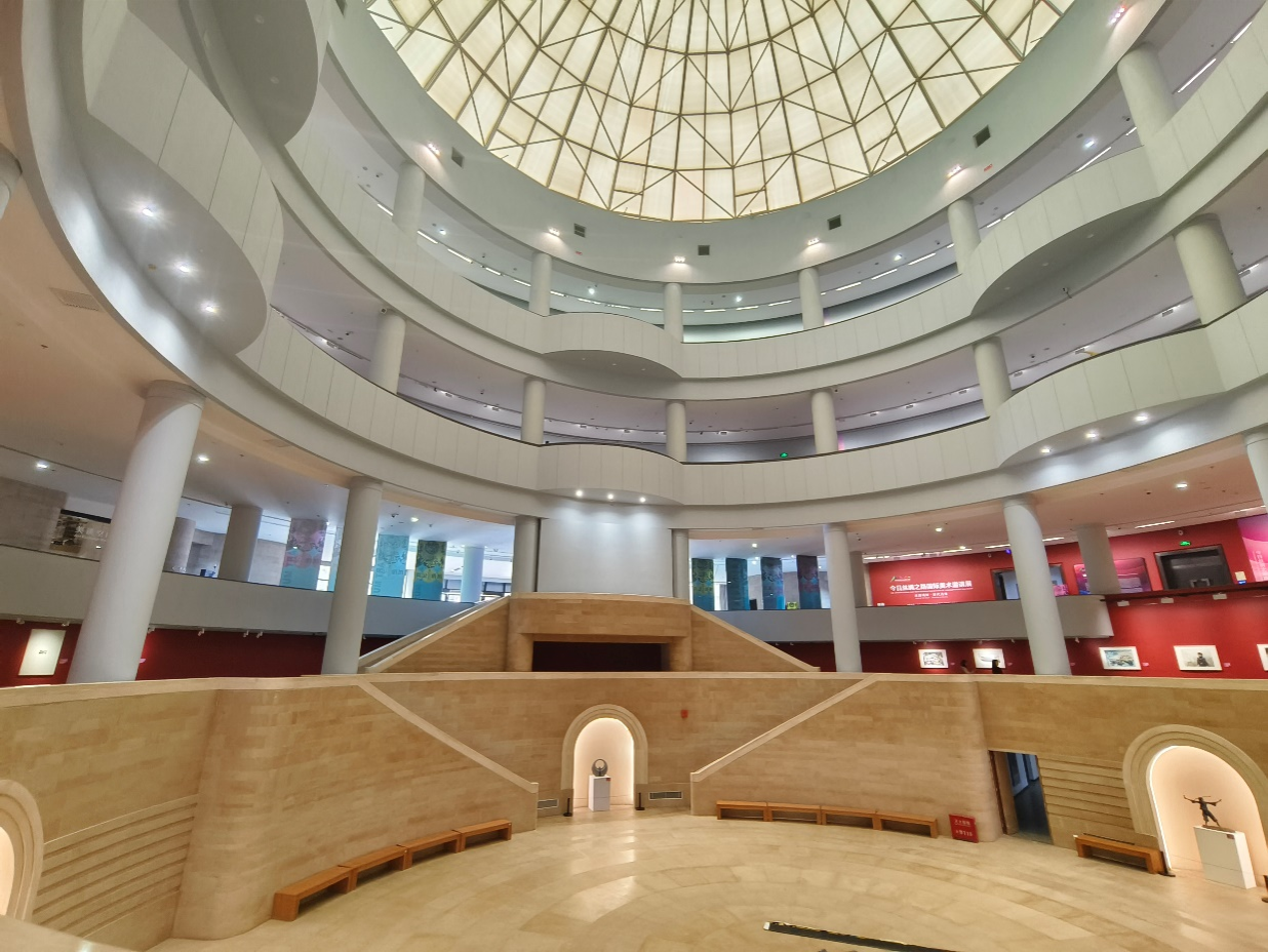 一器一物浓缩文化,方寸之间解码文明。陕西省美术博物馆展览针对各个时期不同的社会背景和环境呈现了不同的主题,艺术家们采用独具匠心的艺术表达形式和精湛的技术给观众们带来了极具特色的视觉盛宴,这些展览不仅是历史的记录,见证了岁月的变迁,同时也是对当下的社会思潮及现代文化的反映。陕西省美术博物馆采用欧洲古罗马建筑风格,馆内自带一个下沉式广场,全玻璃穹顶将自然光影透进来,整个空间充满了强烈的艺术气息,每一件艺术品都展现了博大精深的文化底蕴和创作精髓。这些不同时代的艺术作品,在反映社会现实问题上起到了极大的作用,艺术家们从不同的角度出发,用艺术表达他们的看法和理想。同学们在参观过程中,被浓郁的艺术气息所包裹,氤氲在一幅幅艺术家的作品里,目不暇接,流连忘返。