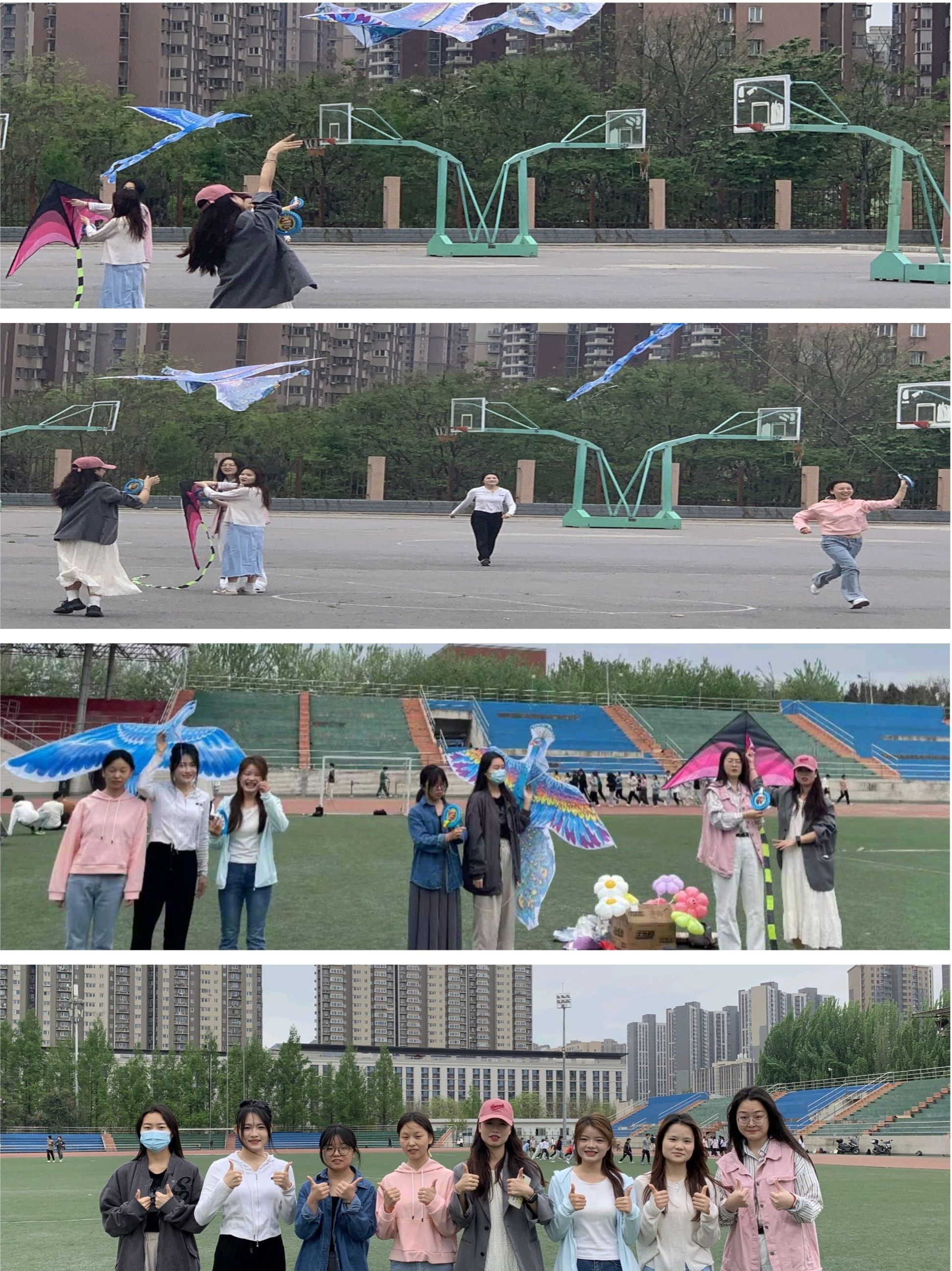 一场别开生面的“贴烧饼”热身赛拉开了活动的序幕,在欢声笑语中同学们消除了许久未见的生疏,营造了轻松愉悦的氛围。尽力东风放纸鸢,白云扶拥上青天。本次活动的主要内容是放风筝比赛。风筝起源于中国,它是中国古人敢想敢干、富有创造精神和生活智慧的生动体现。放风筝作为民间传统游戏之一,承载着人们远离疾病、珍爱生命、迎春祈福等美好愿望。主办方为同学们准备了各式各样的风筝和器具,随着裁判的一声哨响,三个小组的同学相互配合,各展其能,五彩斑斓的风筝飞荡在蓝色天空,它们与地上的红花绿叶遥遥相对、相映成趣,构成了一幅美丽的春日画卷。