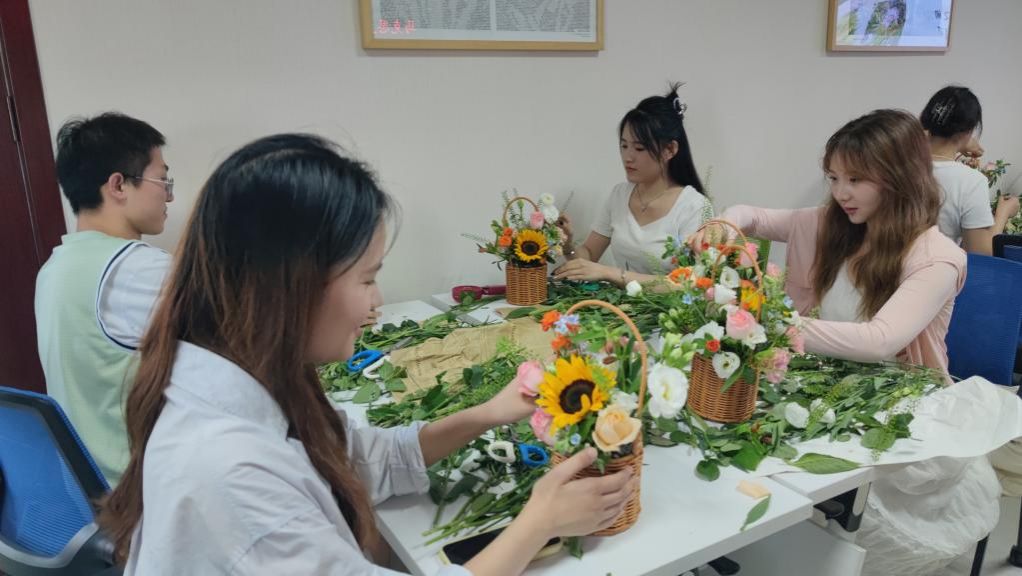 活动伊始,公司邀请的专业花艺师向大家讲解鲜花、花艺知识手把手教大家插花方法。师生们分组分工协作,将一朵朵鲜花亲手制作成一个个色彩斑斓的花篮。之后,大家将亲自制作的鲜花和感恩贺卡送到老师们手中,并送上最诚挚的祝福和感激。每一朵鲜花、每一片绿叶,都蕴含着同学们对老师深深的敬意与感激之情。