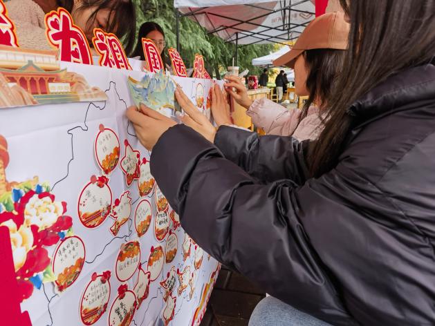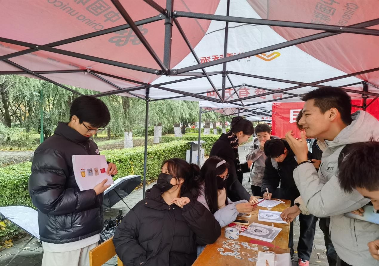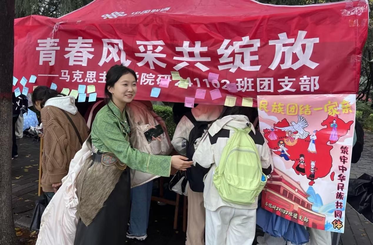 11月19日,团支部面向全校师生开展了“民族团结花盛开,青春风采共绽放”主题活动。此次活动内容丰富多样,涵盖了少数民族特色游戏体验、各民族人像中国版图粘贴、少数民族服饰穿戴体验等。中午时分,全体同学共同唱响《爱我中华》,大家载歌载舞,热闹的场景吸引了过往师生驻足观看、拍照打卡,赢得了在场师生的阵阵掌声与喝彩。