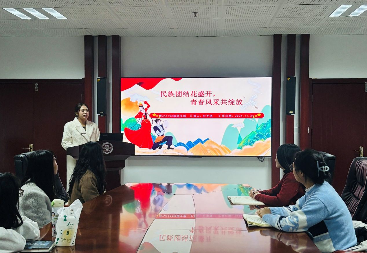 随后,研241102班团支部书记杜宇琪同学围绕“民族团结花盛开,青春风采共绽放”的主题作出汇报。该团支部深入学习习近平总书记关于加强和改进民族工作的重要思想,通过开展丰富多彩的民族活动,传承和弘扬了各民族优秀文化,增进了团员青年对不同民族文化的理解与尊重,使团员青年深刻认识到要铸牢中华民族共同体意识,为实现中华民族伟大复兴共同奋斗。