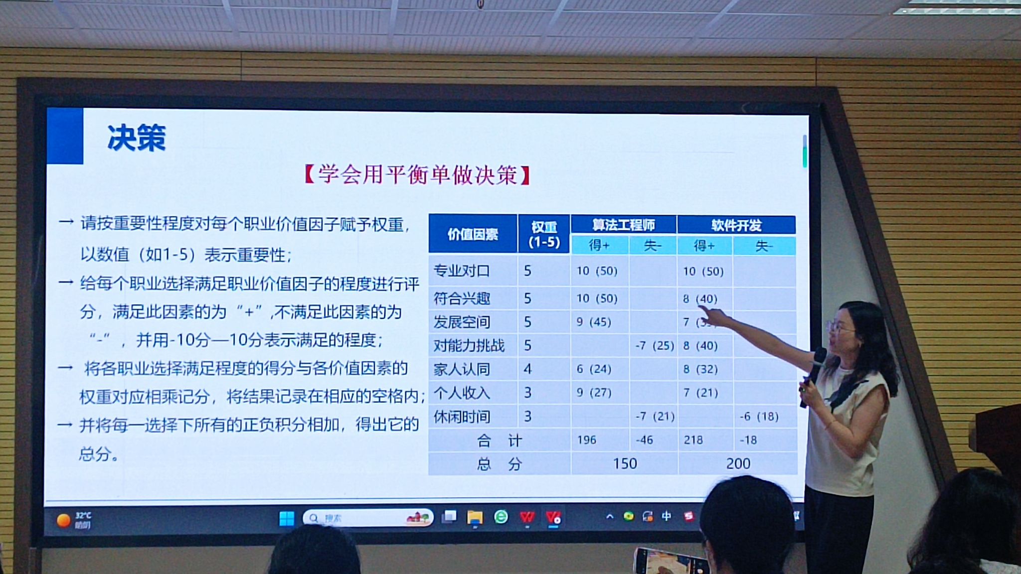 活动伊始,李萍老师以 “求职分析与优势识别” 为核心,结合当下就业形势,引导同学们从个人能力、专业特长、性格特点等维度展开自我剖析,强调清晰的自我认知是职业规划的基石。在 “求职方向与决策” 环节,围绕“入、做、得、拓”认识职业的维度,通过相关实例,以小组为单位探索目标职位的职业代码、任职要求、工作内容等,并详细阐述了如何将个人兴趣、专业背景与市场需求相结合,制定合理职业目标,避免盲目跟风,帮助同学们在职业规划的起点就找准方向。