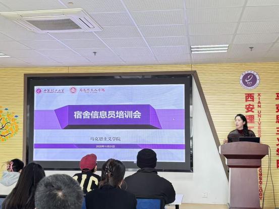 会上,辅导员王莹讲解了宿舍信息员的重要作用,并围绕宿舍信息员角色定位、宿舍人际关系、咨询预约等三大核心主题展开讲解。通过举例,帮助宿舍信息员识别心理信号并及时反馈,要求信息员助人奉献热情主动负责,履行相关职责;在人际关系处理环节,分析人际分析的原因,并传授沟通技巧与冲突化解策略;此外还讲解了宿舍日常安全隐患排查、突发事件应急处理流程等方面,进一步明确了信息员在安全防范、信息报送、沟通协调等方面的职责。