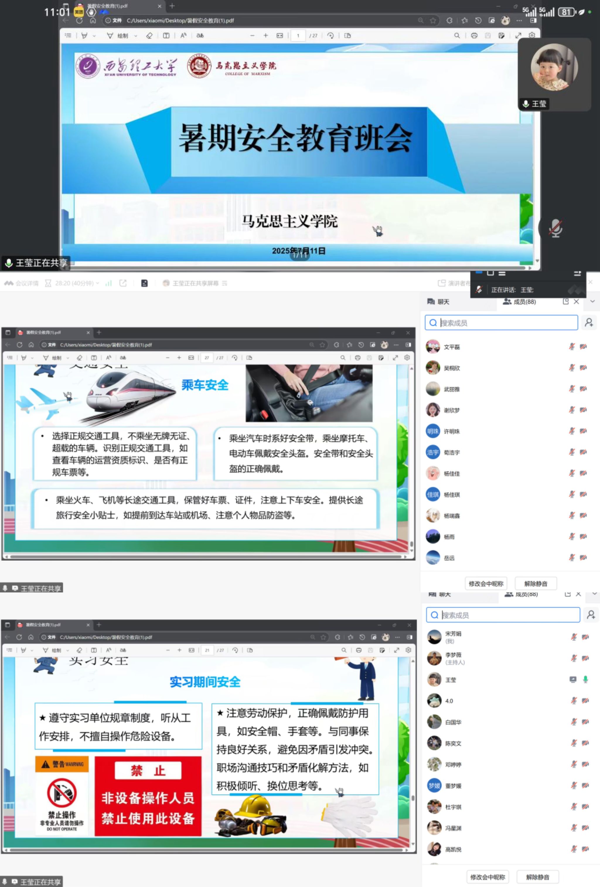 辅导员王莹老师围绕防溺水、防意外伤害、防火防盗防骗三大主题展开,并针对研究生实习实践、科研、出行等场景提出具体建议,为同学们平安度过假期提供了全面建议。对于计划留校或外出实习的同学,特别强调要遵守·公司留校管理规定和实习单位规章制度,保持通讯畅通,定期向家长和辅导员报备动态;对于返乡同学,注意交通安全,确保平安返乡、顺利返校。