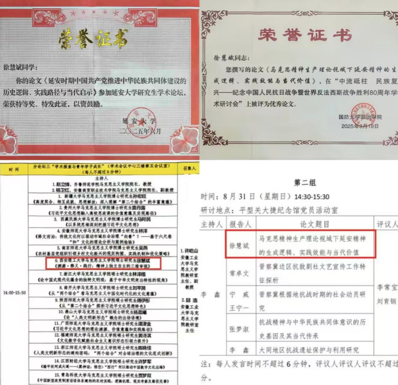 她积极参与高层次学术交流,曾参加由国防大学政治公司、延安大学、安徽工业大学、新疆农业大学等多所院校及研究机构主办的学术会议进行学习与交流。在“延安道路与当代中国”论坛中获特等奖,在抗战史相关研讨会中多次荣获优秀论文奖并作发言。这些经历使她得以追踪学术前沿,在对话与碰撞中深化思考,提升了研究视野与表达能力。