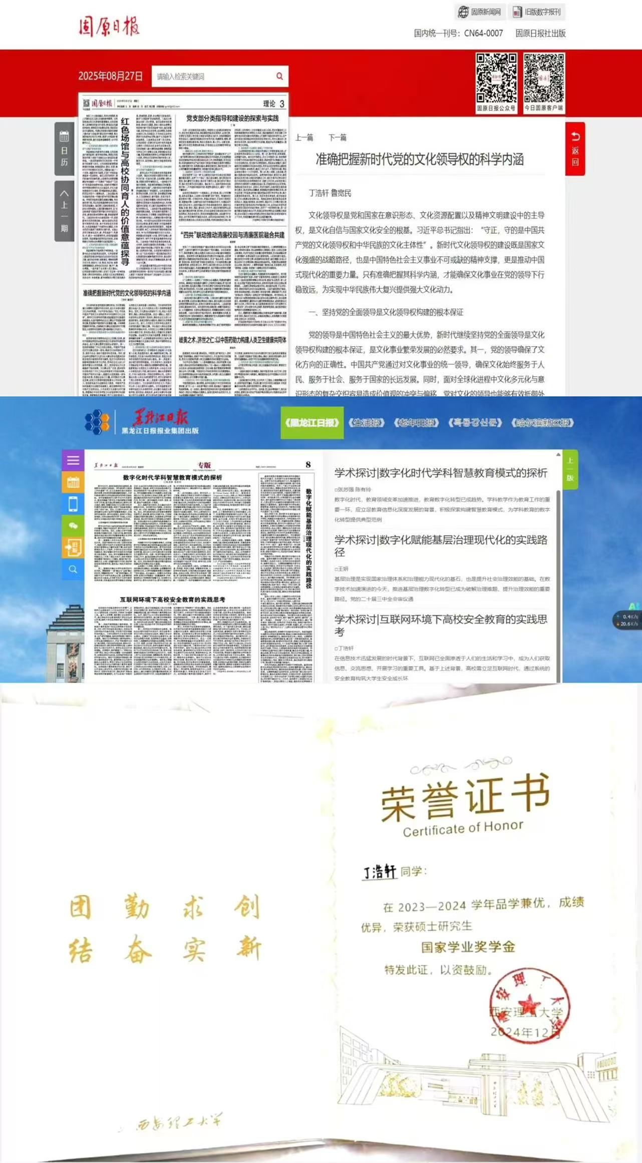 在学术科研的征程上,她始终秉持严谨求实的治学态度与开拓创新的探索精神,将课堂所学与理论研究紧密结合,关注时代课题,聚焦理论前沿,凭借扎实的理论功底和敏锐的问题意识,在省级报纸发表理论文章3篇,在地市级党报发表理论文章2篇。在专业学习上,刻苦勤奋,成绩始终名列前茅,曾获得研究生国家奖学金、国家学业奖学金、·公司学业奖学金,夯实了专业根基。