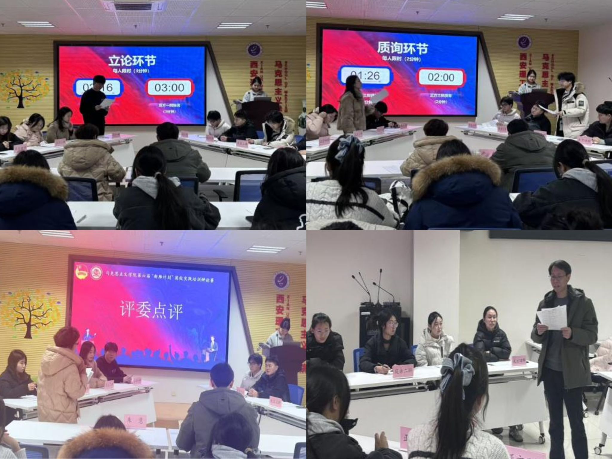 现场,四支经过选拔脱颖而出的队伍展开了精彩的思想交锋。整场比赛高潮迭起,辩手们以马克思主义基本原理为理论武器,围绕当代青年发展的核心议题展开深入探讨,展现出扎实的理论功底和出色的思辨能力。