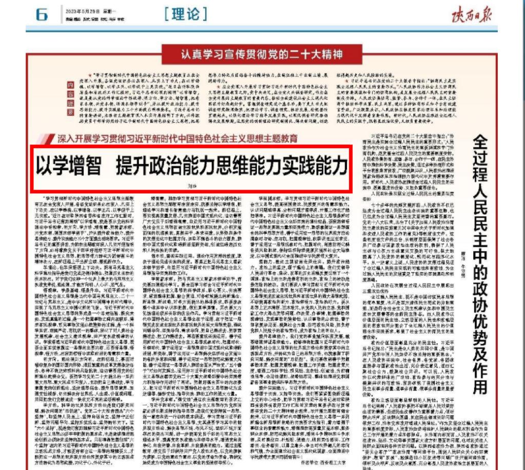 “学习贯彻习近平新时代中国特色社会主义思想主题教育正在全党深入开展,各级党组织务必在深入、扎实上下功夫,在以学铸魂、以学增智、以学正风、以学促干上见实效。”近日在听取陕西省委和省政府工作汇报时,习近平总书记深刻阐明“以学增智,就是要从党的科学理论中悟规律、明方向、学方法、增智慧,把看家本领、兴党本领、强国本领学到手”,并从提升政治能力、提升思维能力、提升实践能力三个方面提出明确要求。习近平总书记的重要讲话,为推动主题教育深入扎实开展指明了方向,必将激励党员干部学好用好习近平新时代中国特色社会主义思想,把思想伟力转化为团结奋斗的精神动力,在新征程上干出新业绩、展现新作为。