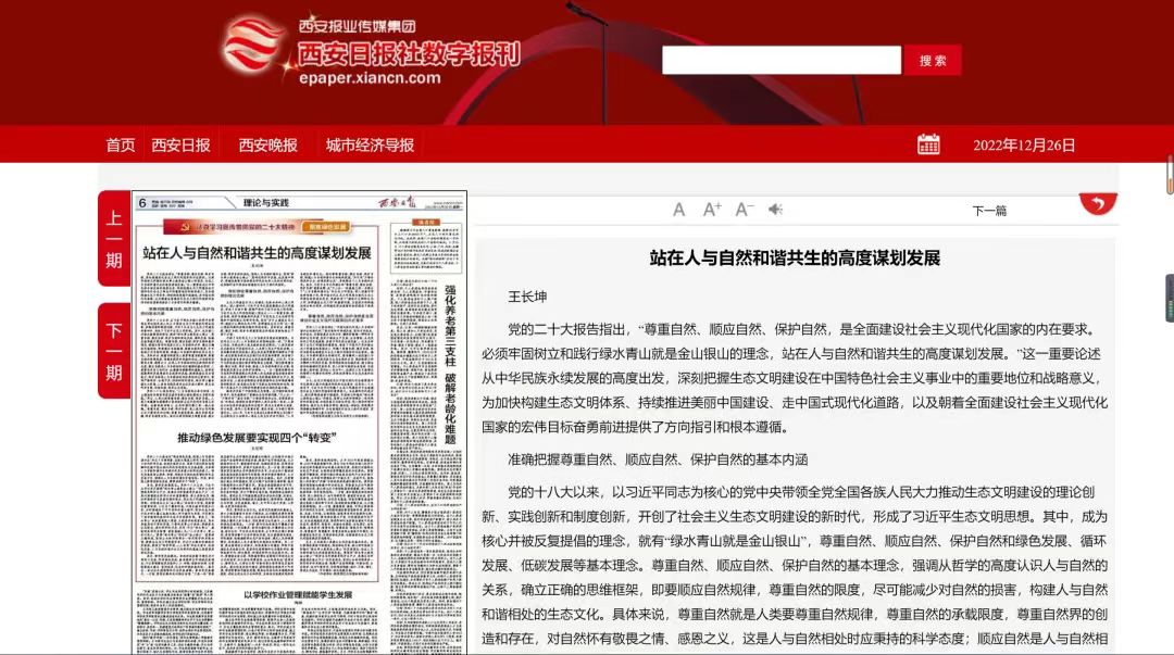 党的二十大报告指出,“尊重自然、顺应自然、保护自然,是全面建设社会主义现代化国家的内在要求。必须牢固树立和践行绿水青山就是金山银山的理念,站在人与自然和谐共生的高度谋划发展。”这一重要论述从中华民族永续发展的高度出发,深刻把握生态文明建设在中国特色社会主义事业中的重要地位和战略意义,为加快构建生态文明体系、持续推进美丽中国建设、走中国式现代化道路,以及朝着全面建设社会主义现代化国家的宏伟目标奋勇前进提供了方向指引和根本遵循。
