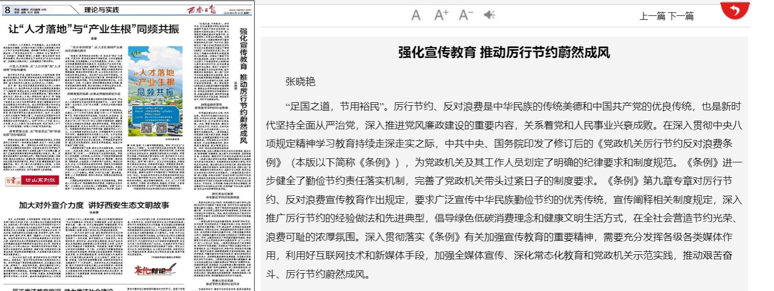 “足国之道,节用裕民”。厉行节约、反对浪费是中华民族的传统美德和中国共产党的优良传统,也是新时代坚持全面从严治党,深入推进党风廉政建设的重要内容,关系着党和人民事业兴衰成败。在深入贯彻中央八项规定精神学习教育持续走深走实之际,中共中央、国务院印发了修订后的《党政机关厉行节约反对浪费条例》(本版以下简称《条例》),为党政机关及其工作人员划定了明确的纪律要求和制度规范。《条例》进一步健全了勤俭节约责任落实机制,完善了党政机关带头过紧日子的制度要求。《条例》第九章专章对厉行节约、反对浪费宣传教育作出规定,要求广泛宣传中华民族勤俭节约的优秀传统,宣传阐释相关制度规定,深入推广厉行节约的经验做法和先进典型,倡导绿色低碳消费理念和健康文明生活方式,在全社会营造节约光荣、浪费可耻的浓厚氛围。深入贯彻落实《条例》有关加强宣传教育的重要精神,需要充分发挥各级各类媒体作用,利用好互联网技术和新媒体手段,加强全媒体宣传、深化常态化教育和党政机关示范实践,推动艰苦奋斗、厉行节约蔚然成风。