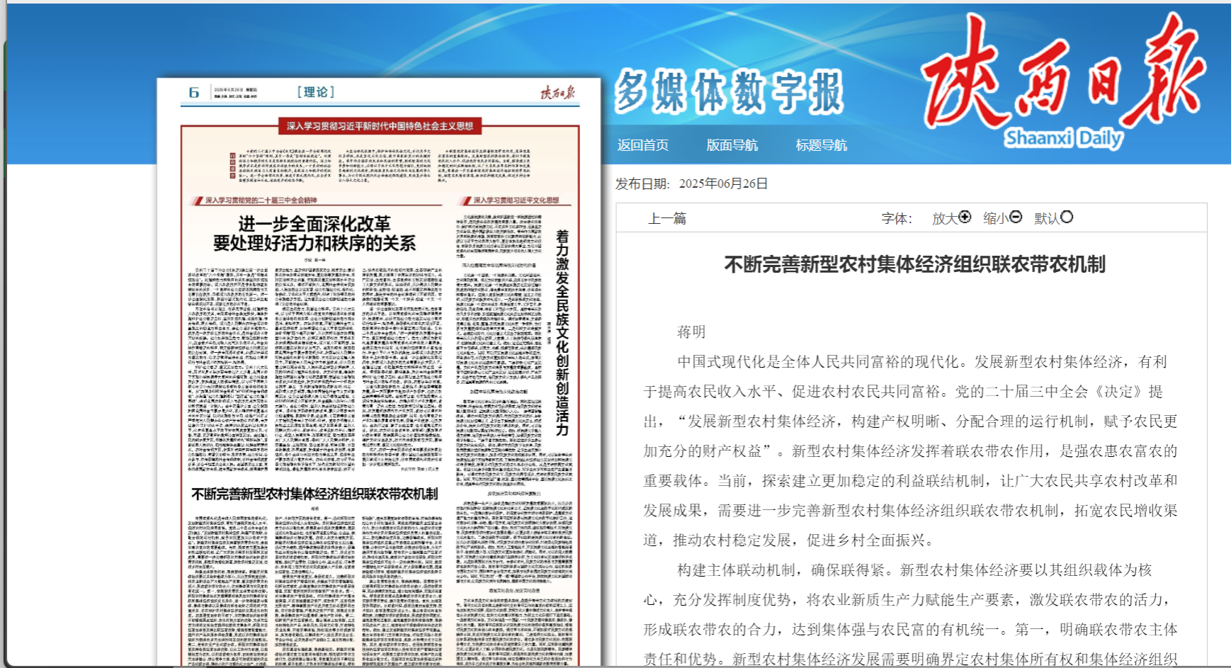 中国式现代化是全体人民共同富裕的现代化。发展新型农村集体经济,有利于提高农民收入水平、促进农村农民共同富裕。党的二十届三中全会《决定》提出,“发展新型农村集体经济,构建产权明晰、分配合理的运行机制,赋予农民更加充分的财产权益”。新型农村集体经济发挥着联农带农作用,是强农惠农富农的重要载体。当前,探索建立更加稳定的利益联结机制,让广大农民共享农村改革和发展成果,需要进一步完善新型农村集体经济组织联农带农机制,拓宽农民增收渠道,推动农村稳定发展,促进乡村全面振兴。
